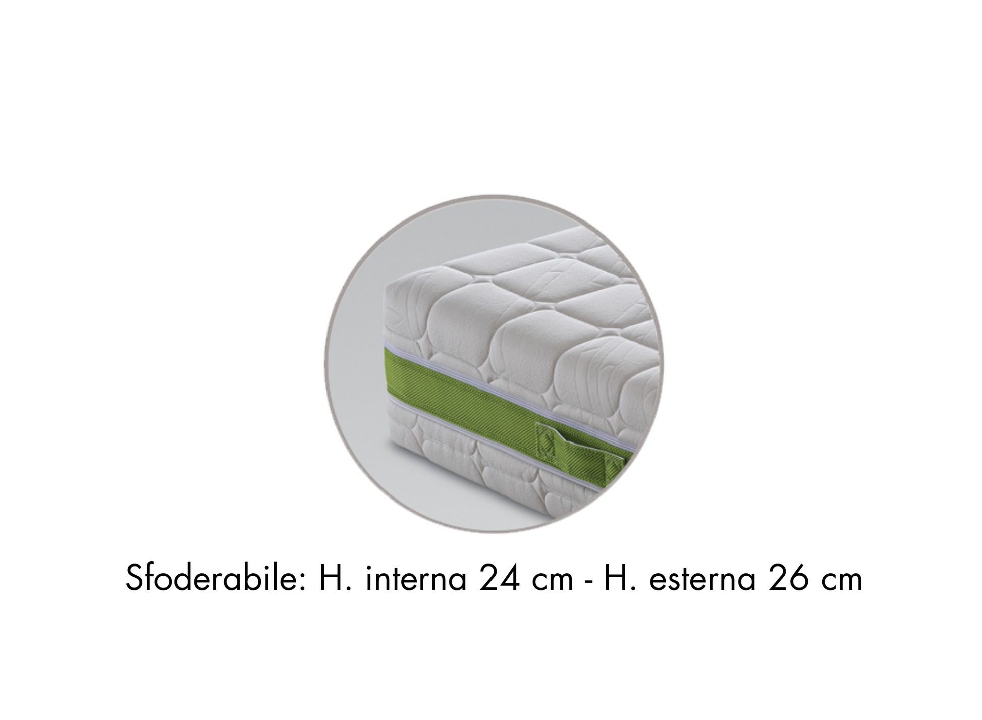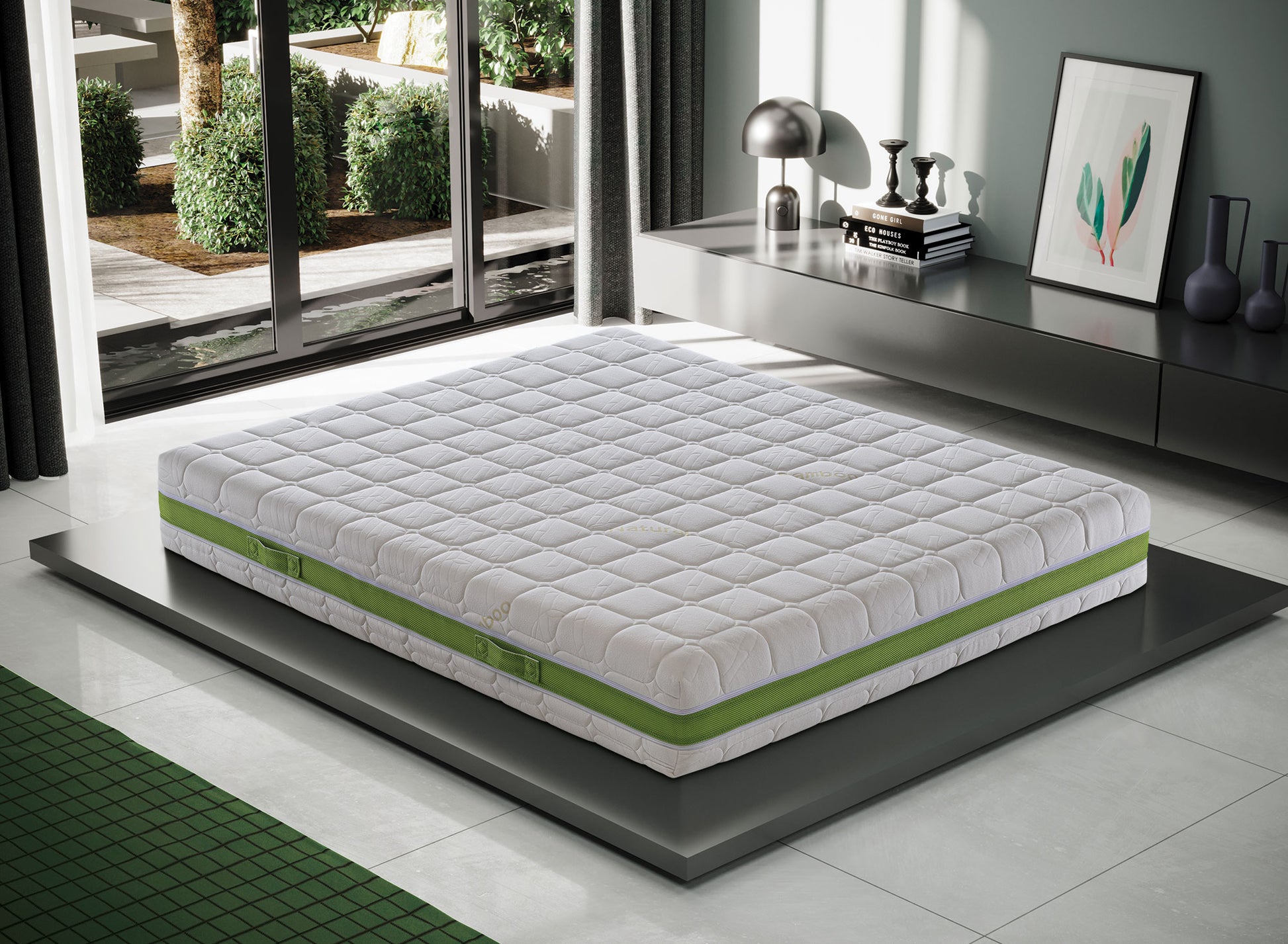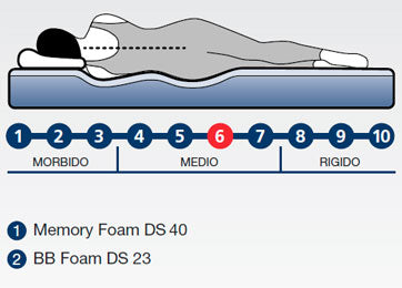 Accoppiata di Memory Foam in superficie di contatto ed uno strato di BB Foam DS 23. È un materasso notevolmente comodo, memorizza le forme e si adatta perfettamente al corpo.