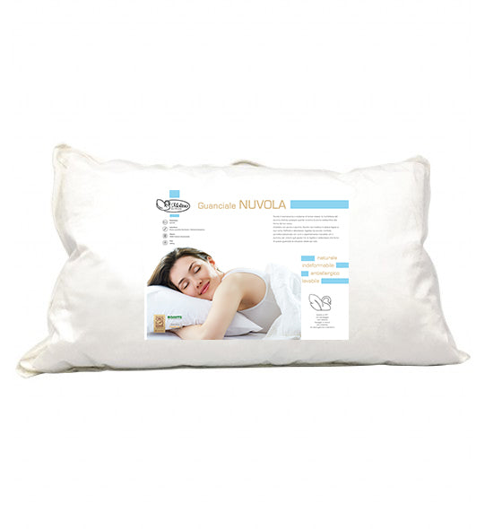 Imbottito con piuma e piumino bianco, Nuvola non tradisce le attese legate al suo nome. Sofficità e delicatezza regalate da piccole, morbide, piumette selezionate con cura e sapientemente miscelate con il piumino, per creare quel giusto mix di rigidità e cedevolezza che fanno di questo guanciale la soluzione ideale per tutti.