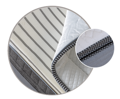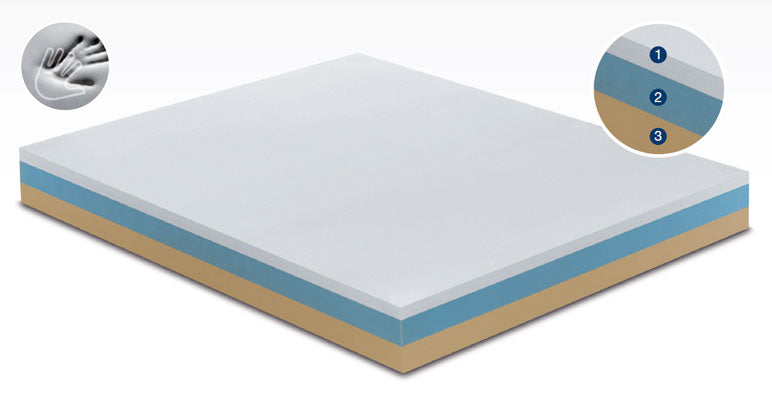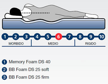 In superficie uno strato di Memory Foam di 4 cm che dà sollievo e prende perfettamente le forme del corpo, adagiato su uno strato di 8 cm di poliuretano espanso di media densità. Alla base un BB Foam di 8 cm, ad una più alta densità che permette un maggior sostegno.